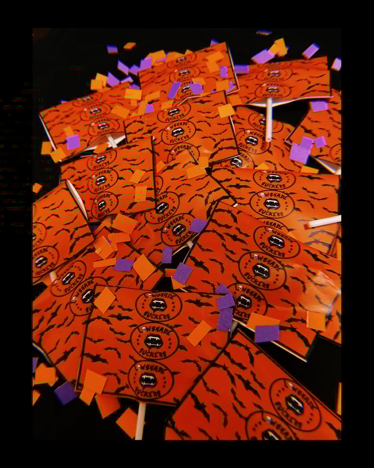 The FAN CLUB PACKAGE comes with a pin, postcard , and a hand wrapped “LOW SHADE SUCKER” (pictured) and is included in each order, after being carefully assembled at Sore Ear HQ.